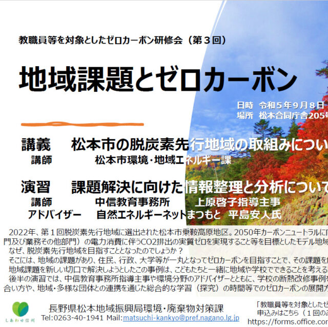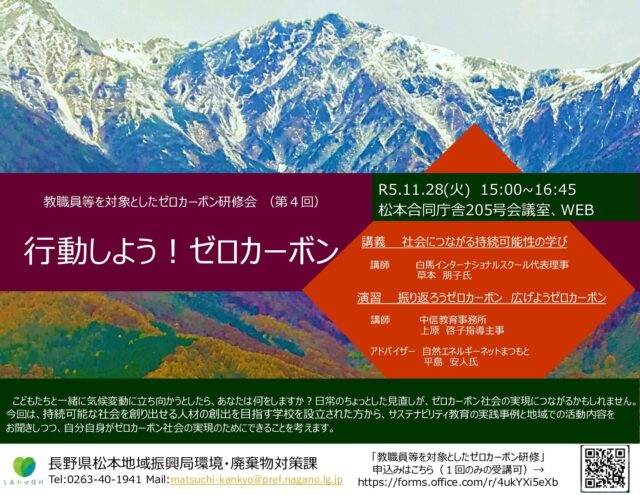 【終了】11/28(火)松本地域振興局主催「教職員等を対象としたゼロカーボン研修会(第4回)行動しよう!ゼロカーボン」を開催します