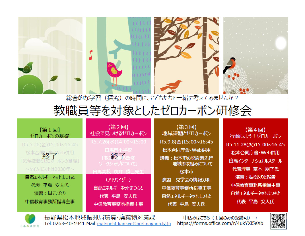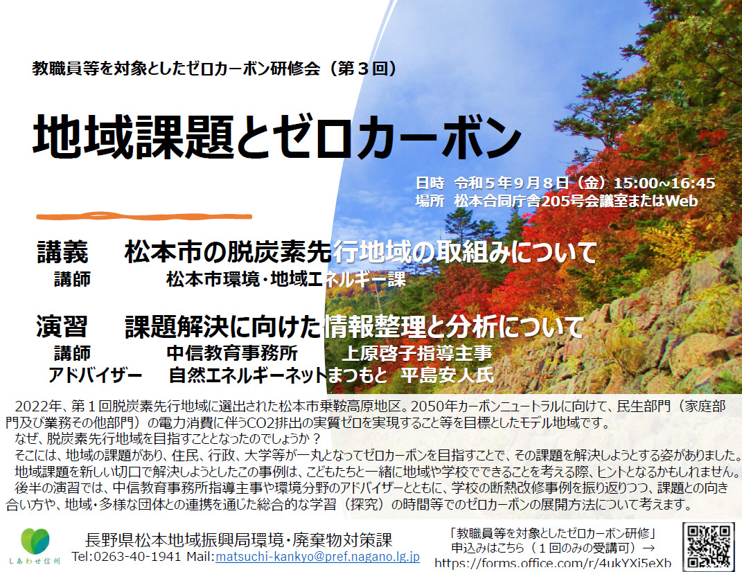 松本地域振興局では、令和5年9月8日(金)の午後3時から、松本合同庁舎で、教職員等を対象としたゼロカーボン研修会(第3回)「地域課題とゼロカーボン」を開催します。