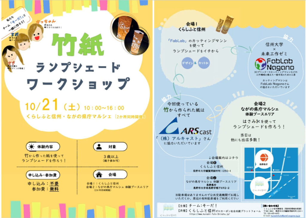 竹紙ランプシェードワークショップは、くらしふと信州拠点のほか、県庁マルシェでも体験できます。