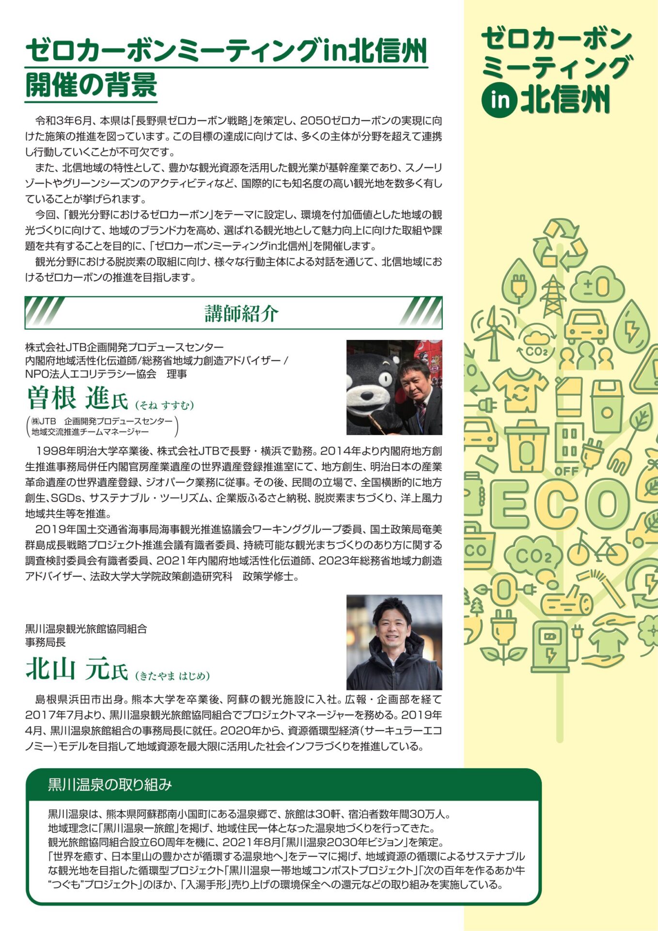 スノーリゾートやグリーンシーズンのアクティビティなどで有名な観光地を多く有する北信地域。今回は「観光分野におけるゼロカーボン」をテーマに、環境を付加価値とした観光地域づくりに向けて、取組や課題を考えます。