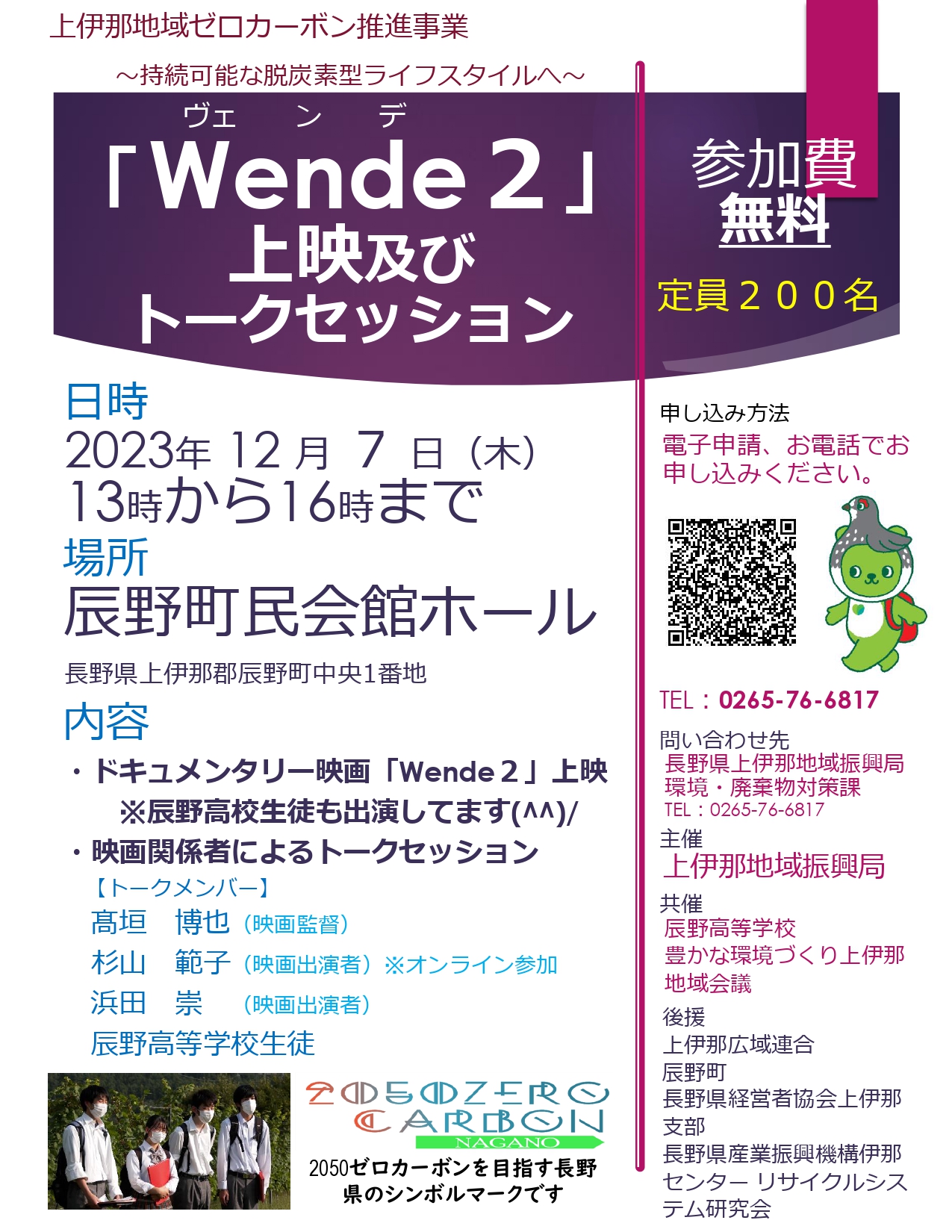 気候変動を題材としたドキュメンタリー映画「Wende(ヴェンデ)2」の上映と同映画出演者等によるトークセッションが行われ、辰野高校の生徒や一般の方など約350名の方に、地球温暖化の現状や気候変動の影響とその対策について、考えていただきました。