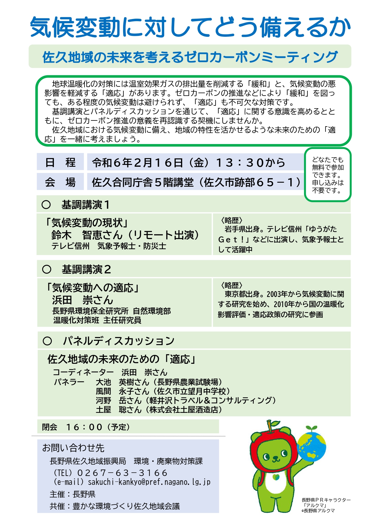 令和6年2月16日(金)の午後1時30分から、佐久合同庁舎で「佐久地域の未来を考えるゼロカーボンミーティング」を開催します。