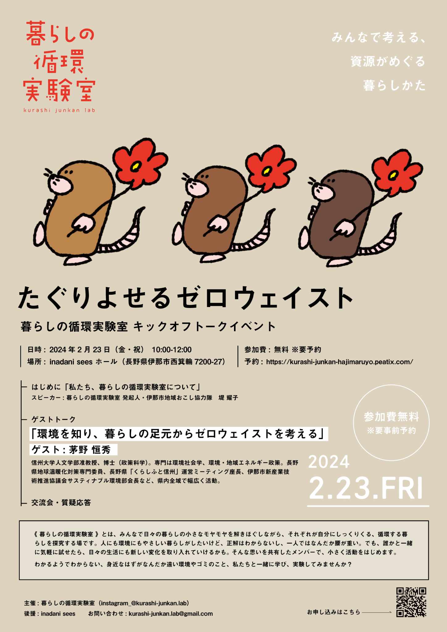 暮らしとのつながりに気づくきっかけとして、くらしふと信州の連携拠点であるinadani seesでは「暮らしの循環実験室」という取り組みが動き出そうとしています。そのキックオフイベントが2月23日(祝)に開催されます。ぜひご参加ください。