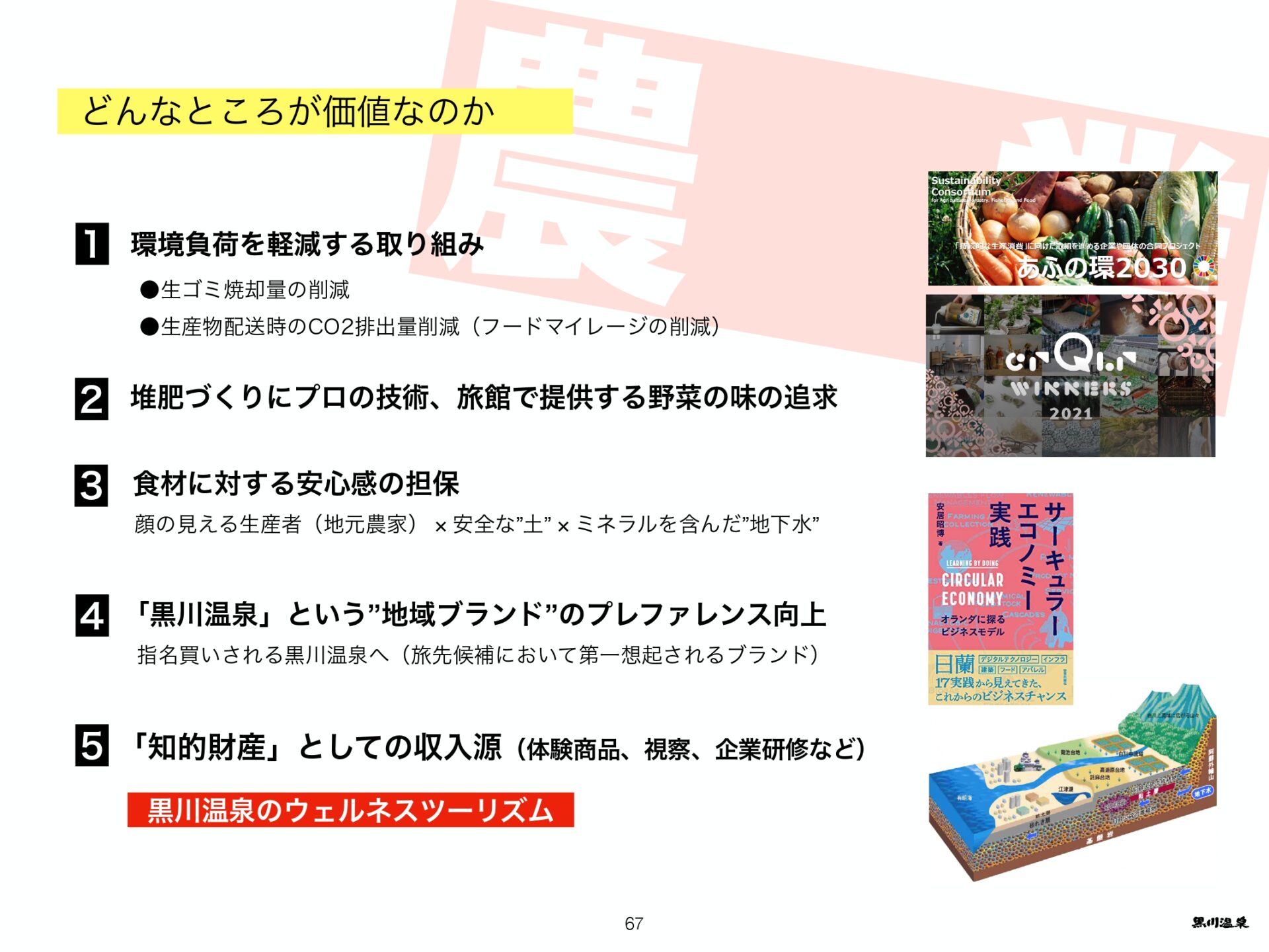 また、ビジョンの具体的な取り組みとして、旅館の生ごみををたい肥化し野菜栽培に使用したり、料理で提供する「黒川温泉一帯地域コンポストプロジェクト」等を紹介いただきました。