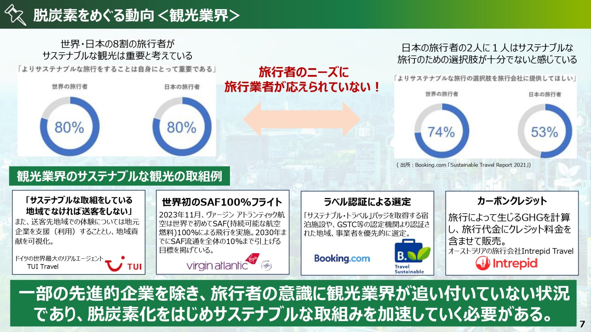 近年、旅行者の意識も変化し、世界では約8割の方がサステナブルな旅行を希望していること、