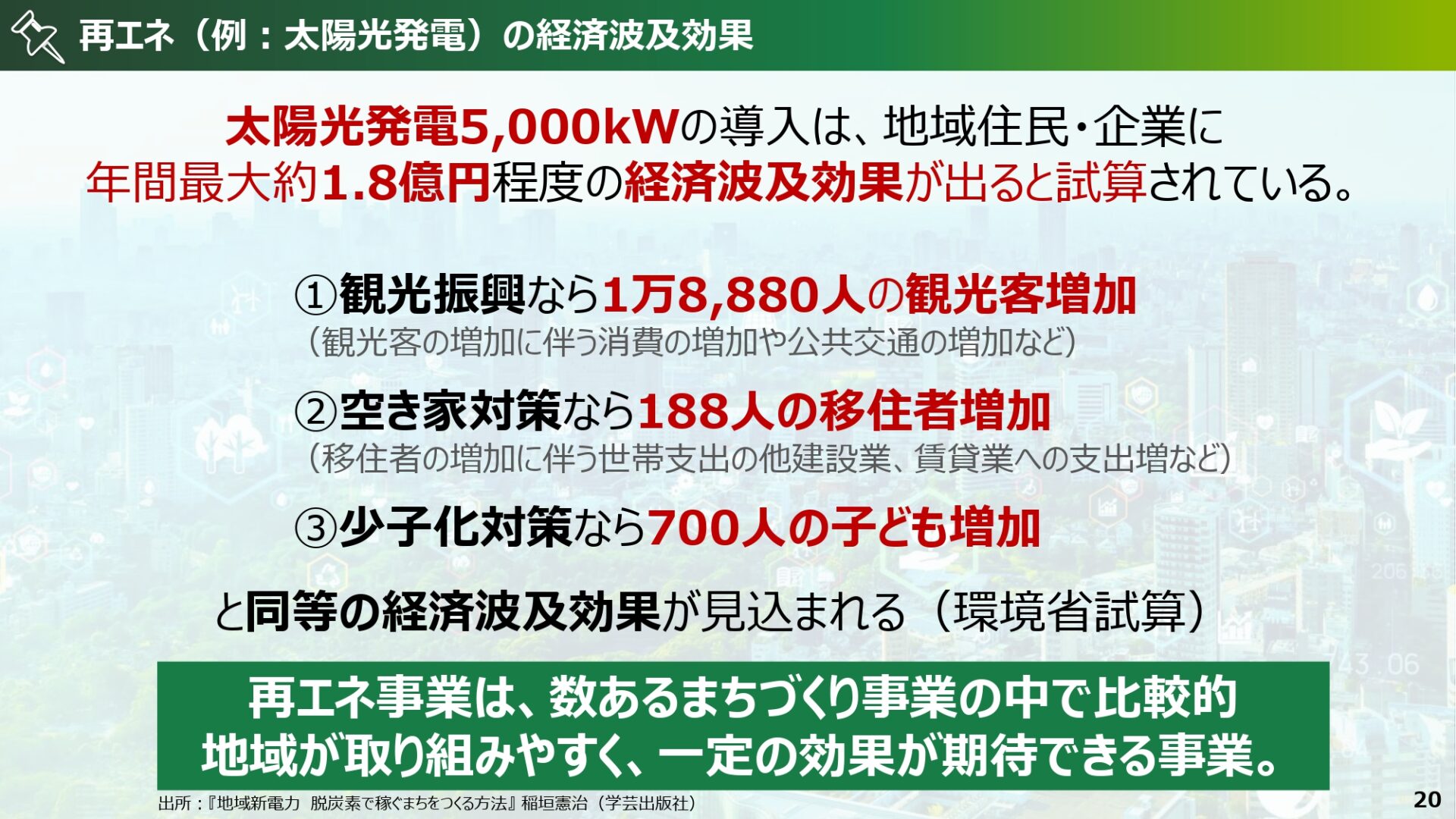 地域が脱炭素に取り組むことで、経済波及効果、ブランド価値価値向上、観光客数増加等の効果が見込め、雇用増・産業再生・循環経済により地方創生につながること、