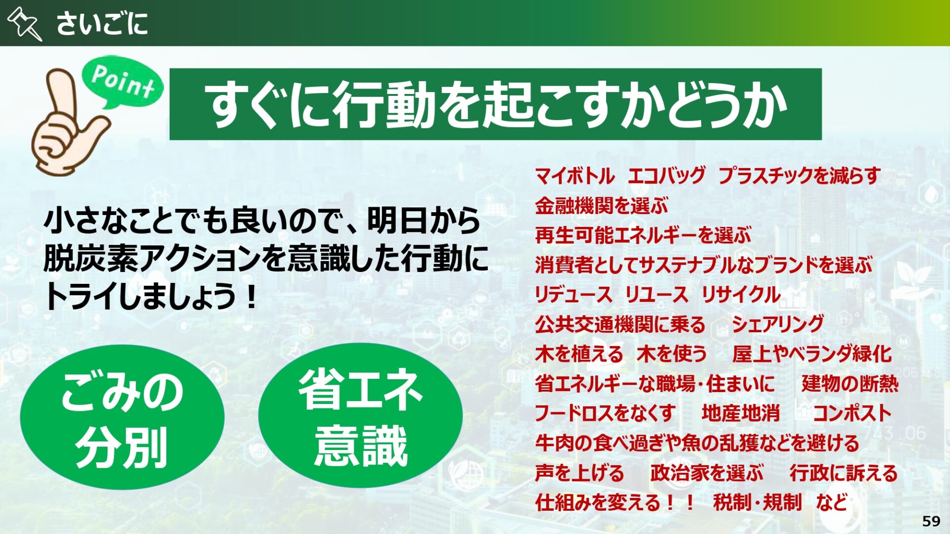 最後に、 小さなことでも、明日から脱炭素アクションを意識した行動にトライすることの大切さを教えていただきました。