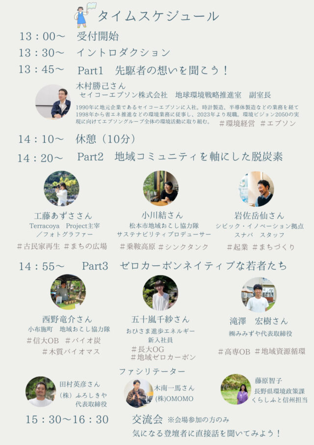 興味や関心はあっても、どんな関わり方や仕事があるのかはまだまだ見えにくいのではないでしょうか?実は、長野県内各地には様々な関わり方でゼロカーボン実現につながる取組・仕事があります。先輩たちの想いやこれまでのキャリアをのぞいてみよう!