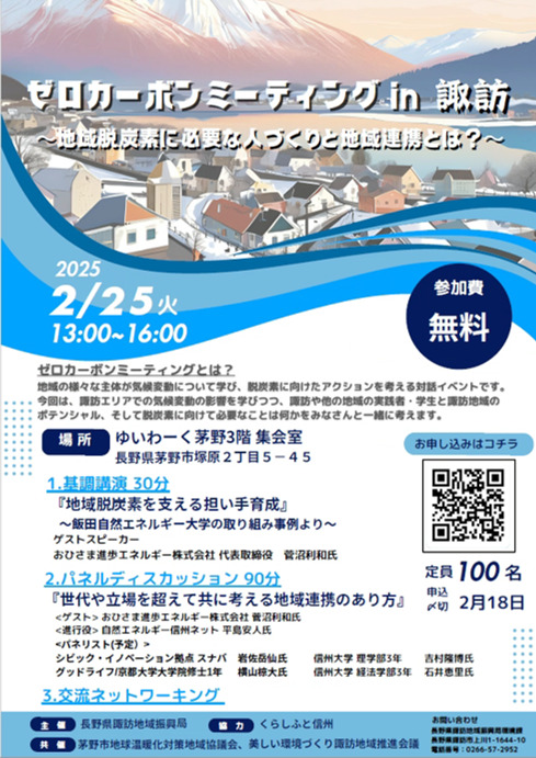 地域の様々な主体が気候変動について学び、脱炭素に向けたアクションを考える対話イベント「ゼロカーボンミーティングin諏訪~地域脱炭素に必要な人づくりと地域連携とは?~」を開催します。