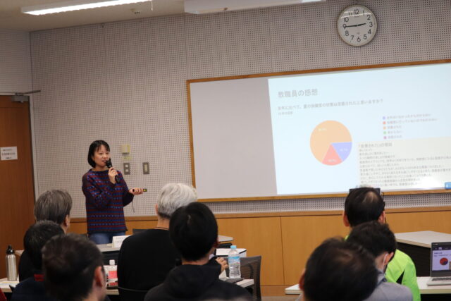 大日向小学校で断熱WSを企画した保護者の方からは、児童の「教室が暑い」という声に対して、単にエアコン導入しよう、ではなく、それでいいのか?環境負荷を減らすために何かできることはないか?と問いを投げかけたところからスタートしたや実施後の教職員アンケートの結果などを教えてもらいました。