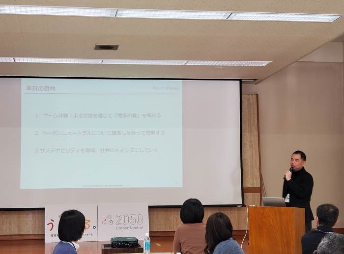 今回使用したカードゲームは、「2050カーボンニュートラル」。参加者が企業や行政、金融機関など12のチームに分かれ、それぞれが定められた目標の達成に向かって活動する中で炭素の動きが理解できるシミュレーションゲームです。2050カーボンニュートラル公認ファシリテーターの熊谷健太郎氏、開米泰介氏の進行のもと、事務局も含めた会場全員でカードゲームを楽しみました。
