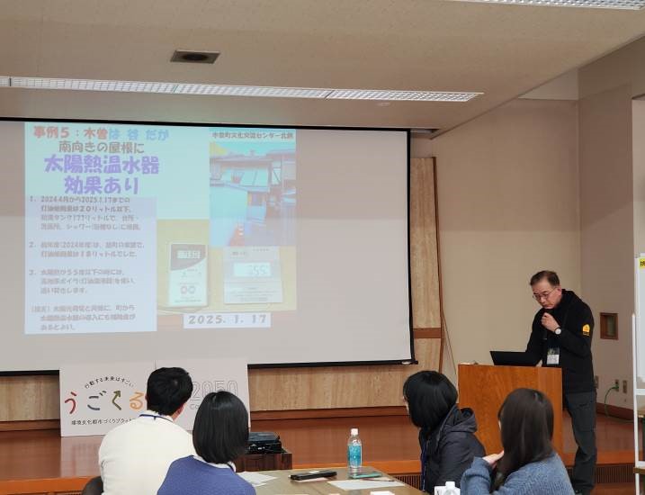 はじめに、取組事例の参考として環境省 環境カウンセラーの池戸通徳氏に話題提供をいただきました。池戸氏からは、飯田市や木曽町における木材利用に関する事例紹介や、自身の自宅等における「ペチカ」の導入、太陽熱の利用といった取組の紹介がありました。