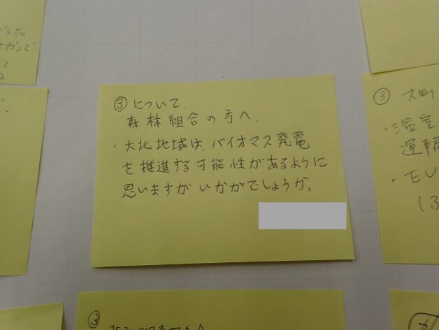 また、会場からは森林組合に向けて、「バイオマス発電を推進する必要があると思うがいかがか」といった質問があり、「バイオマス発電は木材が限られてしまい、海外から適した材を運ぶと運搬時の温室効果ガス排出の観点からも、熱利用のほうが効率がいいと言われている。熱利用であれば、松くい虫の被害にあった支障木なども利用でき、地産地消も進むのでは」との回答がありました。