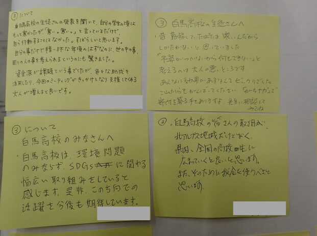 ・白馬高校生徒からは、学校で使用している灯油ストーブもCO2を排出していて、少しでも減らすために断熱改修もしながらストーブも変えてみたい、太陽光パネルにも興味がある。帰ったら校長先生に話してみたいといったご発言をいただきました。