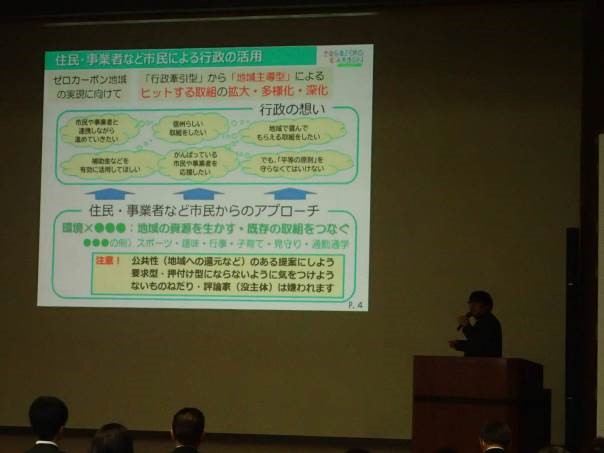 「行政主導」から「地域主導」で市民からアプローチすることの重要性を説明され、取組のヒントやアイデアをどのように生み出すかについてもご説明いただきました。