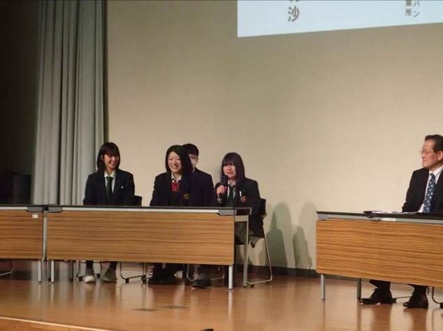 白馬高校の1年生3人が登壇。(浦野さん、岡本さん、デイリーさん)