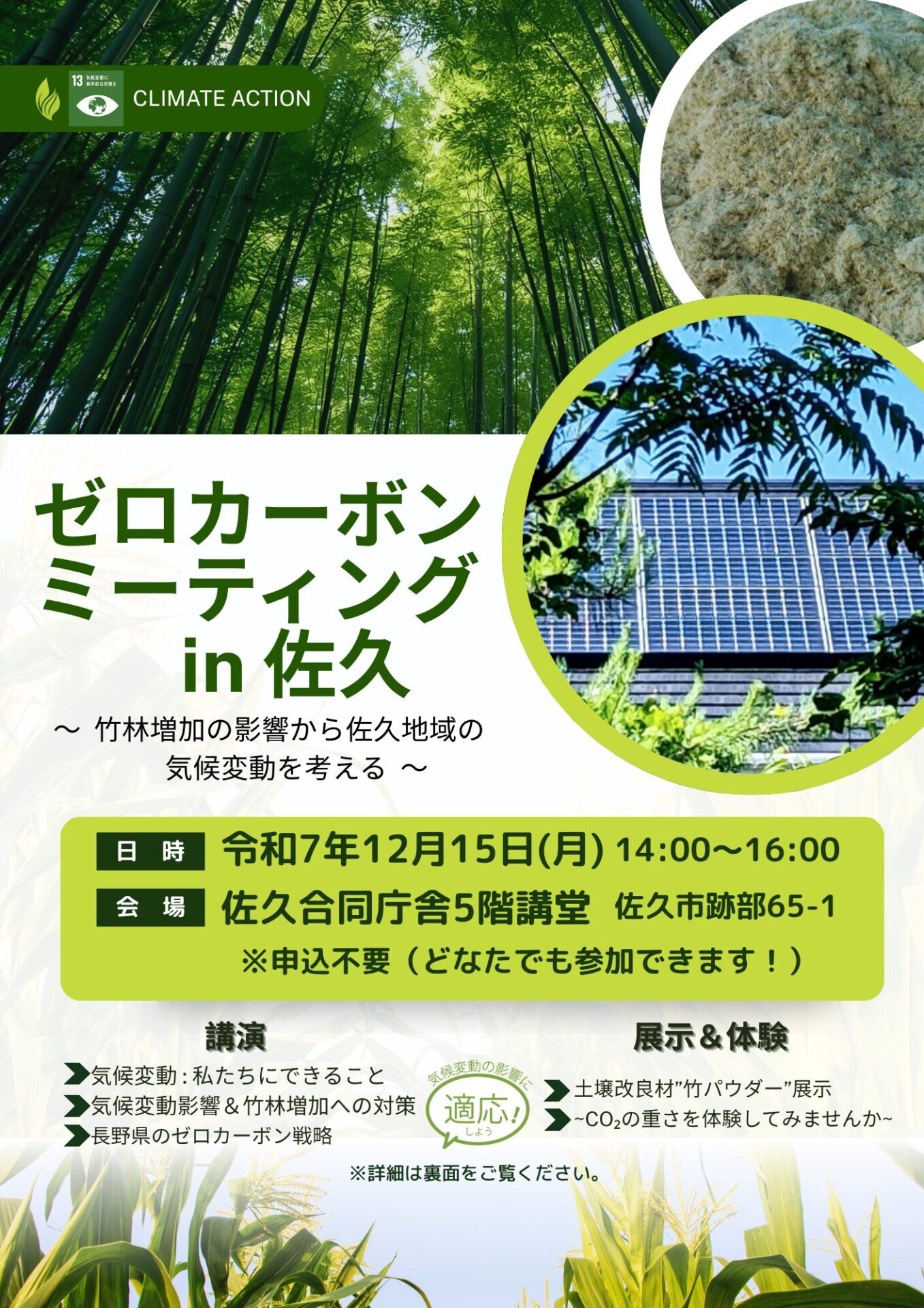 長野県佐久地域振興局では、昨今、放置竹林が佐久地域でも課題となっていることから、竹林増加の一因として指摘される気候変動や、竹林を上手に活用する方策への理解を深めるため、ゼロカーボンミーティングin佐久を開催します。