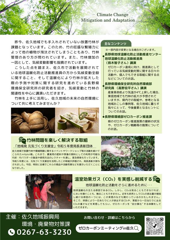 長野県地球温暖化防止活動推進員の鈴木 智子 氏、長野県環境保全研究所研究員 高野 宏平 氏による気候変動等に関する講演のほか、佐久地域で放置竹林に関する活動を続けてきたmillpot様による竹を活用した製品や活動写真の展示なども行われます。