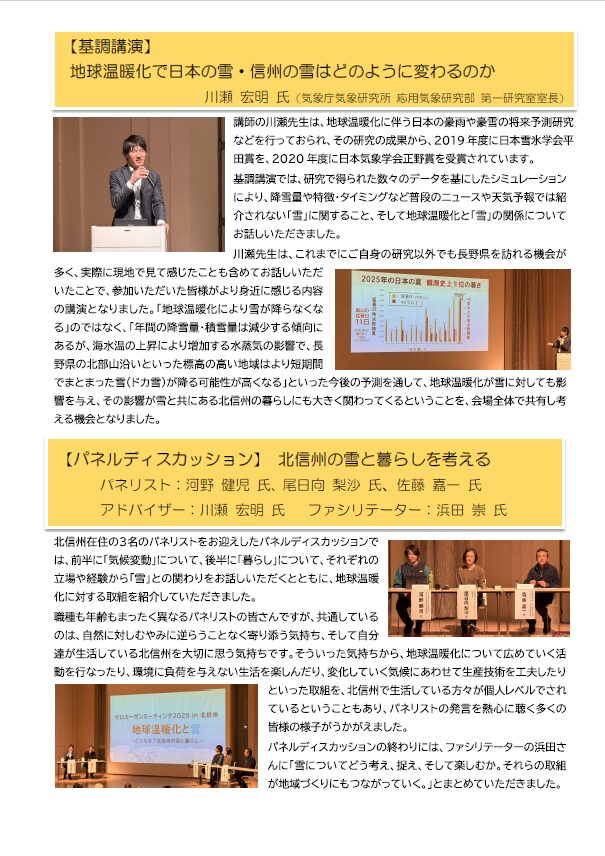 前日からの初雪が観測される中、当日は総勢76名の皆様に参加いただき、北信州におけるこのテーマへの関心の高さがうかがえました。気象学・気候学、雪氷学のスペシャリストである講師による基調講演や、北信州在住のパネリストによるパネルディスカッションを聴講できる有意義な機会であったとともに、参加された皆さんのゼロカーボンに対する取組につながることが期待できる場にもなった様子が感じられました。