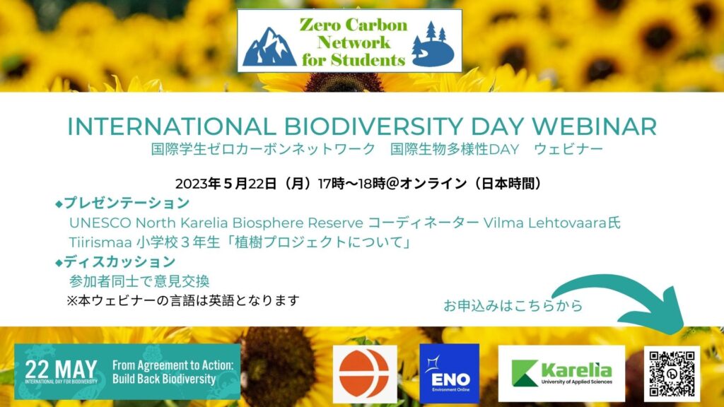 第3回(5月22日)は国際生物多様性デーに合わせて、“生物多様性”をテーマにして、フィンランドの学校での取り組み紹介、専門家からお話を聞いたあと交流をしました。