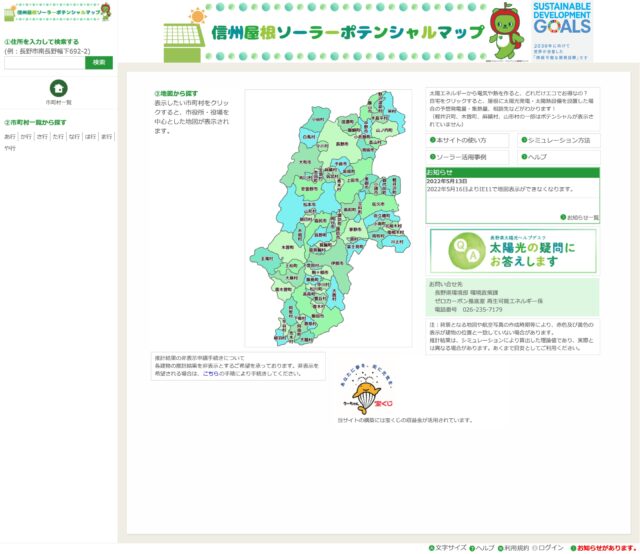 県内の建物ごとに太陽光発電・太陽熱利用のポテンシャルを表示しています。