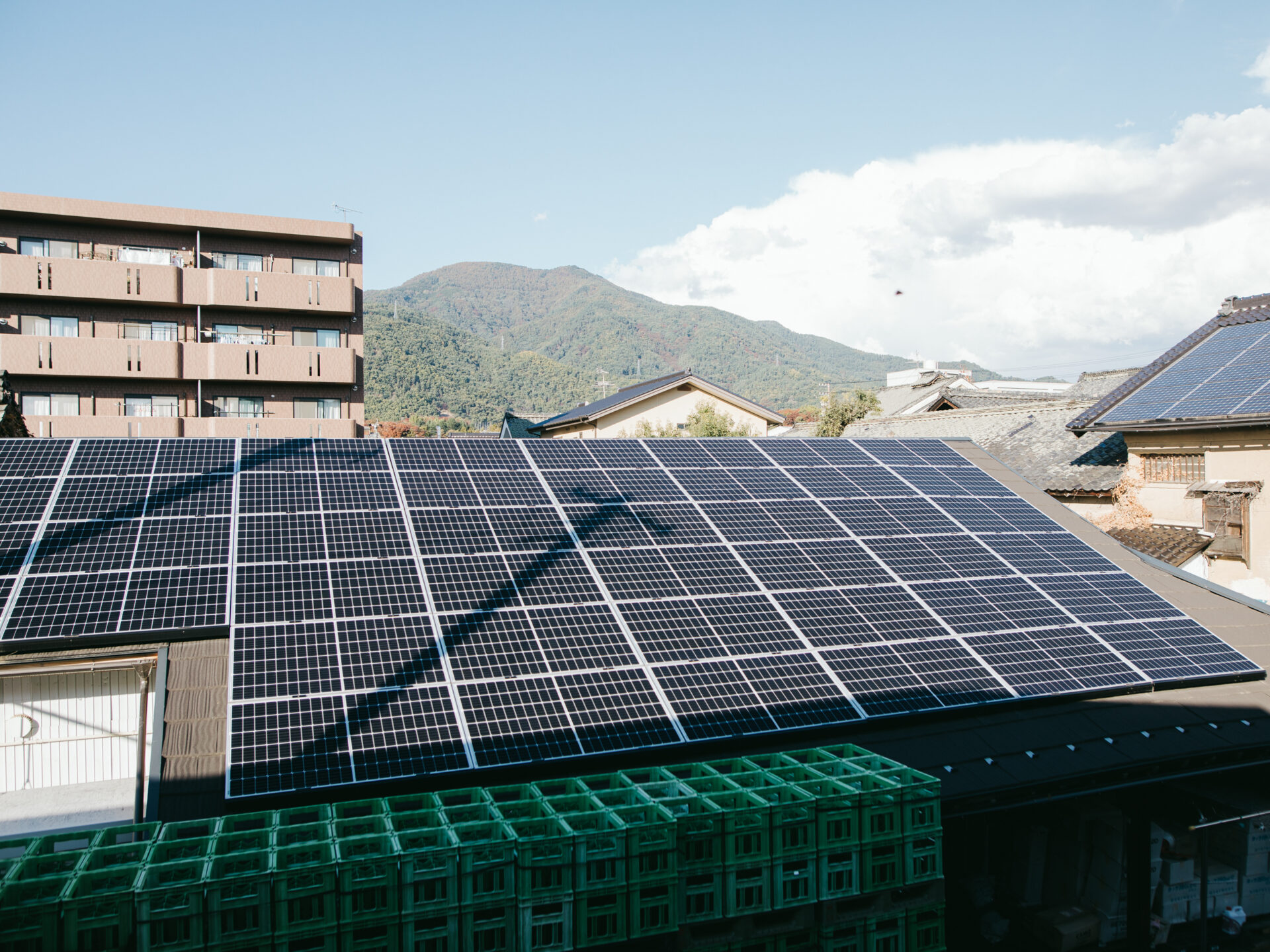 岡崎酒造では、酒蔵の倉庫の屋根にパネルを置いています。屋根オーナーは、規定の条件に合えば設置費用なしでパネルを設置できるので、負担なく発電ができています。