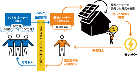 岡崎さん:相乗りくんは、日当たりのいい屋根をもつ「屋根オーナー」と、太陽光発電に出資したい「パネルオーナー」をつないで太陽光パネルを設置し、売電収入をシェアする仕組みです。