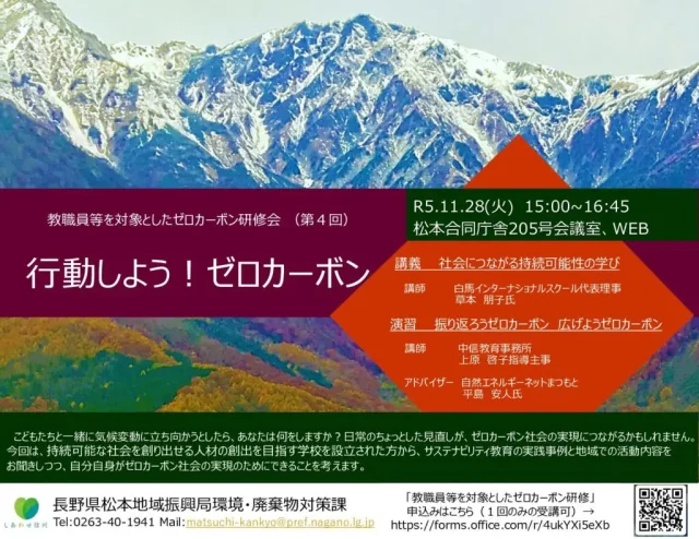2023.11.17【終了】11/28(火)松本地域振興局主催「教職員等を対象としたゼロカーボン研修会(第4回)行動しよう!ゼロカーボン」を開催します -